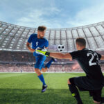 Wide shot striker kicking ball inside crowded stadium